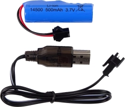 Enthalten sind ein 3,7‑V‑500‑mAh‑Li‑Ion‑Akku und ein USB‑Kabel, sodass der Kran bequem über Computer oder Adapter mit USB‑Port geladen werden kann.