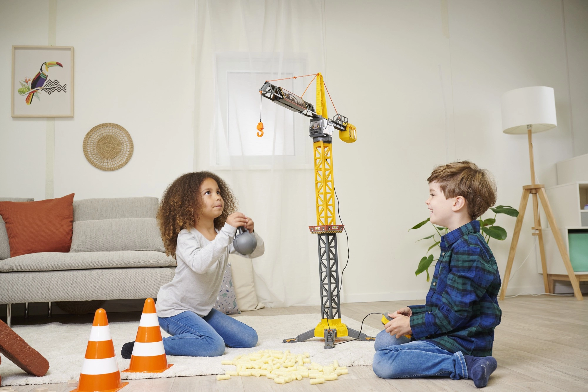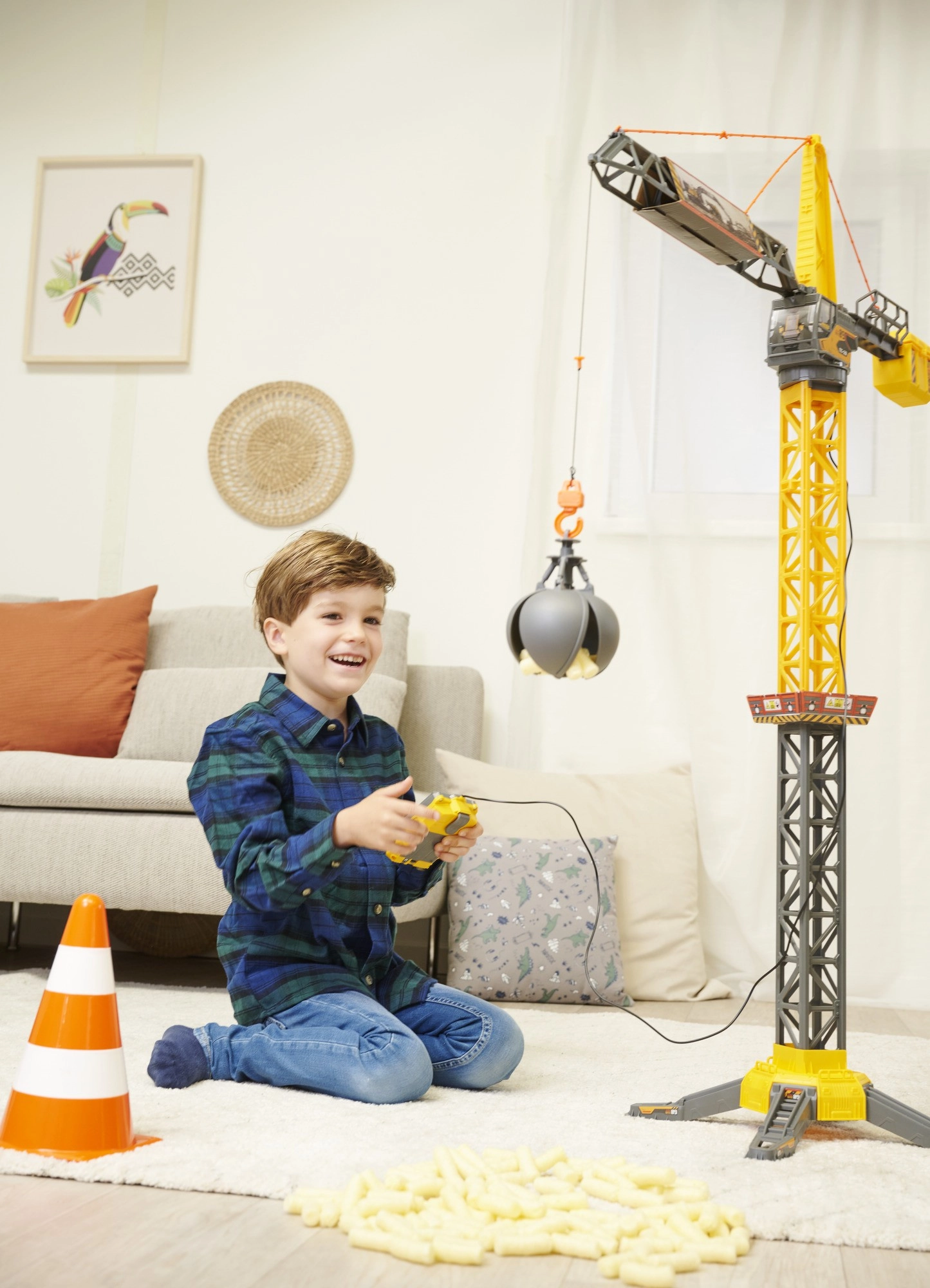 Die einfache Handsteuerung ermöglicht das Heben und Senken des Hakens sowie das Verschieben der Last am Ausleger. Sicher und intuitiv zu bedienen, auch für jüngere Kinder geeignet.