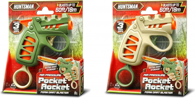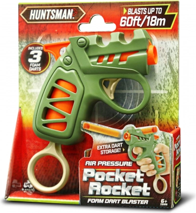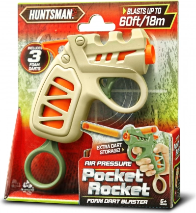 Die kompakte Taschenpistole HUNTSMAN mit einer Länge von 13 cm überzeugt durch einfache Bedienung und eine Reichweite von bis zu 18 m. Die Pfeile werden einfach in den Lauf eingesetzt, gespannt wird über den Ring an der Unterseite, und der Schuss erfolgt über den Abzug. Im Lieferumfang finden Sie 3 Schaumstoffpfeile, zur Auswahl stehen 2 Farbvarianten – grün und braun.
