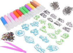Entdecken Sie endlosen Spaß mit dem Kreativset für kleine Künstler! Gestalten Sie eigene Anhänger mit Weltraum-, Dinosaurier- und Auto-Motiven mithilfe von 24 Gummischablonen, 12 bunten Farben und funkelnden Steinchen. Dank der beiliegenden Pinzette und Metallketten ist das Basteln einfach, sauber und die Ergebnisse sind wunderschön präzise.