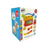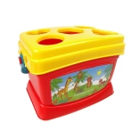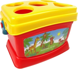 Der Eimer mit Deckel dient als Formensortierer mit Tiermotiven, wodurch interaktives Spielen und das Erkennen von Formen und Farben ermöglicht wird.