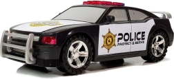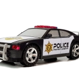 Schwarz-weiße Streife mit Blaulicht, Abzeichen und Stoßfänger für actionreiche Verfolgungen. Ideal für Rollenspiele und spielerisches Lernen von Sicherheitsregeln.