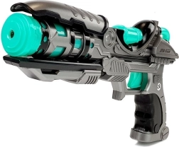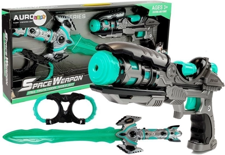 Dieses Weltraum-Set versetzt Kinder in die Welt galaktischer Missionen. Die Laserpistole und das Lichtschwert leuchten und geben Geräusche von sich, wodurch das Spiel realistisch und spannend wirkt. Die Farbkombination aus silber, schwarz und türkis erscheint futuristisch und attraktiv.