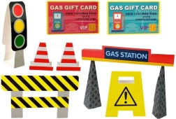Ampel, Schilder, Hütchen, Barriere und Karten für die Zapfsäule verleihen dem Spiel Verkehrsregeln und eine realistische Atmosphäre.