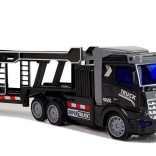 Dieser detailreich gestaltete Abschleppzug bietet Kindern ein authentisches Erlebnis beim Steuern einer Sattelzugmaschine mit Autotransportauflieger. Robuste Verarbeitung aus hochwertigem Kunststoff, leuchtende LED-Scheinwerfer und die einfache Bedienung erhöhen den Spielspaß und die Realitätsnähe. Dank der kompakten Abmessungen passt der Zug perfekt auf jede Strecke im Kinderzimmer.