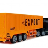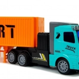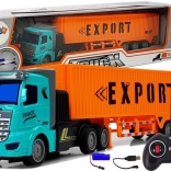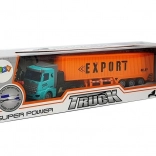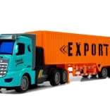 Die türkisfarbene Kabine und der orange Auflieger mit den Aufschriften EXPORT/PORT sorgen für den originalgetreuen Look eines echten Lastwagens – ideal für imaginäre Frachttransporte.