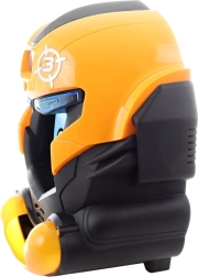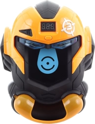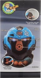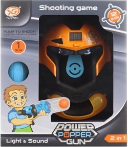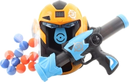 Dieses Action-Set verbindet Schießspaß mit Präzisionstraining. Das Ziel in Form einer futuristischen Maske verfügt über einen digitalen Zähler, der nach Einlegen von 2× AA-Batterien jeden Treffer registriert und Töne abspielt. Die Pistole verschießt weiche Schaumstoffkugeln per manuellem Pumpen, zusätzliche Elektronik ist nicht erforderlich.