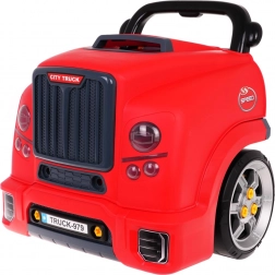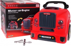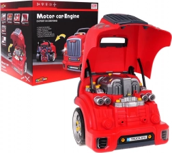 Dieses realistische, interaktive Set verwandelt Kinder in geschickte Mechaniker. Die Front des Lastwagens mit hochklappbarer Motorhaube verbirgt einen großen, zerlegbaren Motor, bei dem sich Zündkerzen und Räder wechseln lassen. Auf dem Armaturenbrett befinden sich Startknopf mit Startgeräuschen, Lenkrad mit Hupe, Warnanzeige und Schalthebel. Ein praktischer Tragegriff erleichtert den Transport, unter dem Lenkrad gibt es ein Fach für Werkzeug und Schrauben.