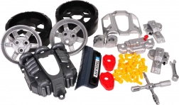 Frontteil des Fahrzeugs mit Motor, Räder mit Radkappen, 31 Schrauben, Werkzeug, dekorative Aufkleber, Anleitung