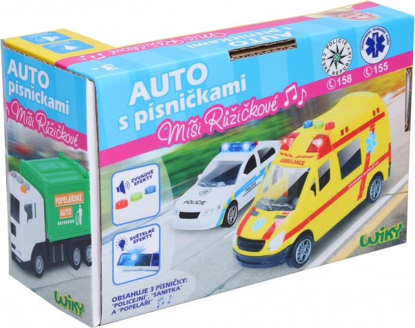 Bereiten Sie sich auf unterhaltsame Momente mit diesem einzigartigen Krankenwagen mit Schwungradantrieb vor, der mit drei beliebten Liedern von Míša Růžičková ausgestattet ist, darunter 'Krankenwagen', 'Polizei' und 'Müllabfuhr'.