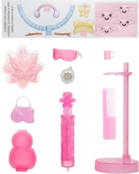 Der rosafarbene Winterlook wird durch Brille, Handtasche, Bürste und einen Ständer zum Ausstellen ergänzt. Perfekt zum Stylen, Spielen und Fotografieren.