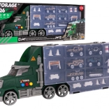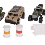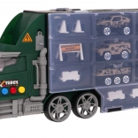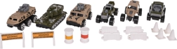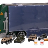 Das Set enthält 6 Metall/gefederte Spielzeugautos des Typs „Resorak“ sowie umfangreiches Zubehör (Kegel, Zäune, Barrieren, Fässer) zum Bau eigener Hindernisstrecken und militärischer Szenarien. Ein praktischer Tragegriff hilft dem Kind, den Lastwagen überallhin mitzunehmen.