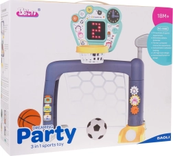 Fußballtor mit Basketballkorb, .- Gummi-Basketball, .- Gummi-Fußball, .- Gummi-Golfball, .- Golfschläger, .- interaktives Panel mit Punkte- und Punktanzeige, .- Bedienungsanleitung, .- Ballbehälter. . |