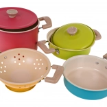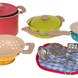 Zwei Töpfe mit Deckeln, eine Pfanne und ein Sieb aus Metall wirken authentisch und halten intensivem Kinderspiel stand.