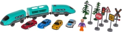 Im Paket findest du alles für eine komplette Szene: Schienen, Brücke, Tunnel, Papp-Supermarkt, Verkehrsschilder, Bäume, 4 Autos, eine Figur und eine Lampe. Dank der 92 Elemente kannst du die Anordnung beliebig verändern und immer neue Strecken gestalten.