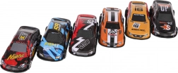 Enthalten sind sechs detailreich gestaltete Rennwagen im Maßstab 1:64 mit robuster Metallkarosserie, bereit für sofortige Rennen.