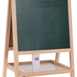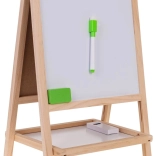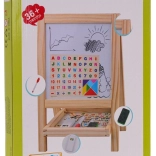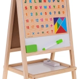 Doppelseitige Tafel aus Holz für Kinder ab 3 Jahren. Eine Seite ist weiß zum Malen mit Stift, die andere ist schwarz zum Malen mit Kreide. Die Tafel ist auf beiden Seiten magnetisch und enthält Buchstaben, Zahlen und geometrische Formen als Magnete.
