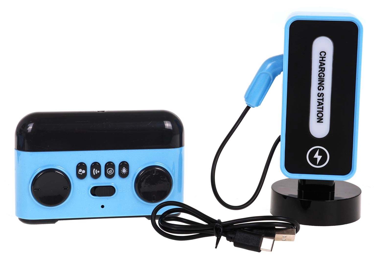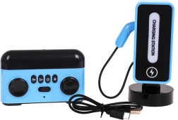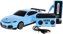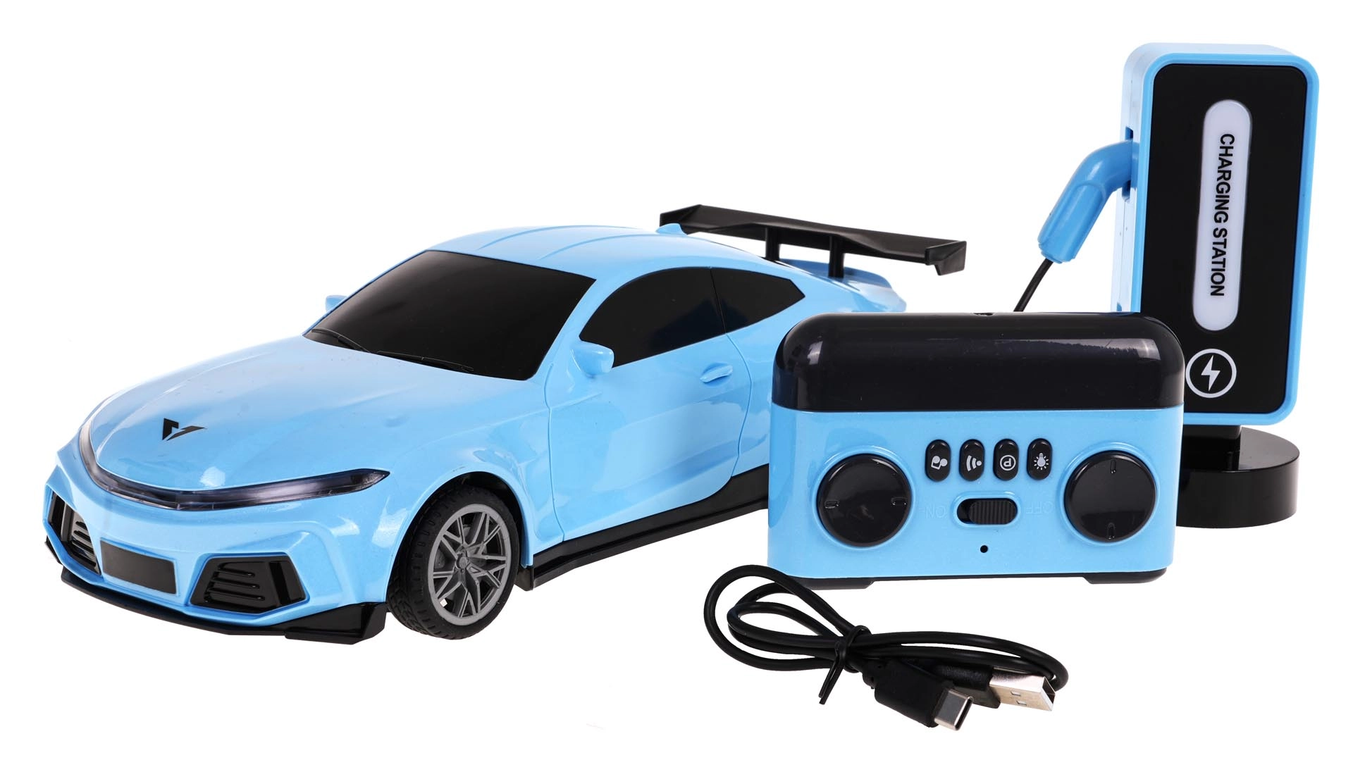 Inklusive stylischer Ladestation mit Beleuchtung und beleuchtetem Ladeanschluss. Das Auto hat einen integrierten 3,7 V 400 mAh Akku, die Station 3,7 V 1200 mAh; die Fernbedienung benötigt 2× AA 1,5 V (nicht enthalten). Dank 2,4 GHz ist die Steuerung stabil und störungsarm.
