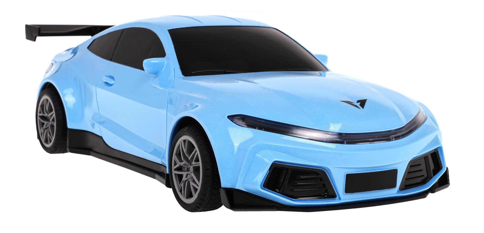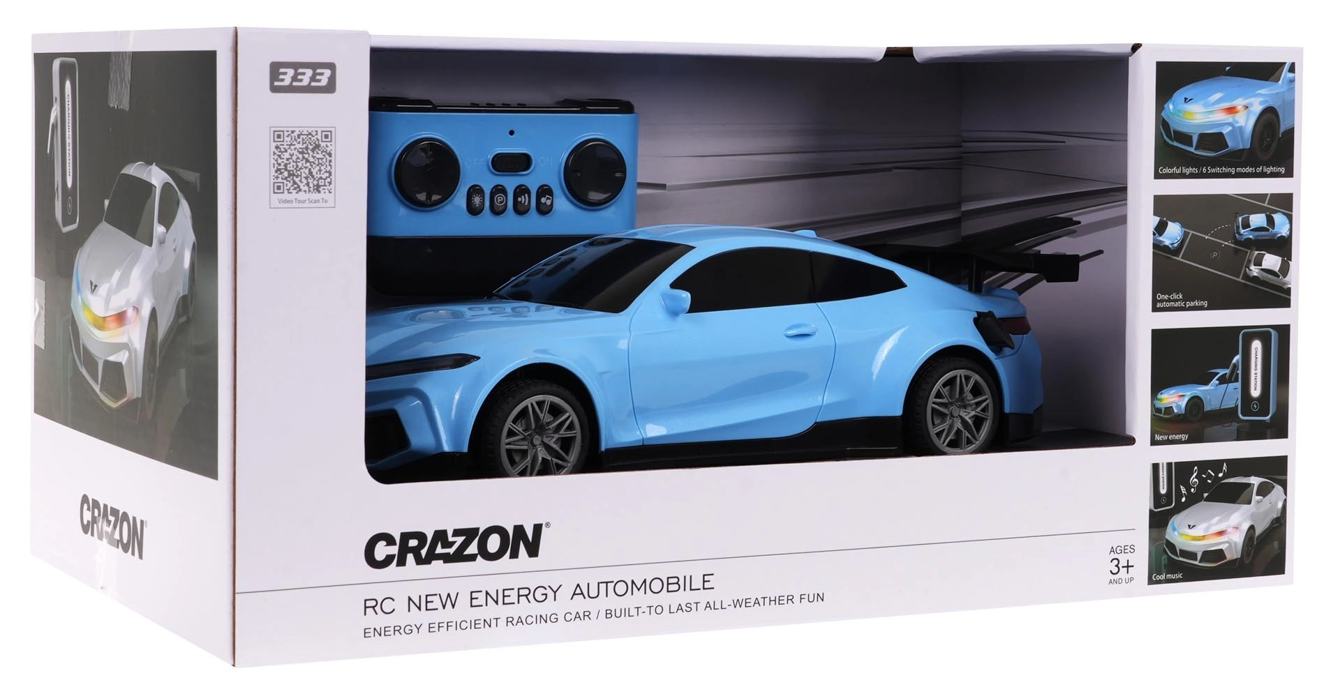Das RC-Auto mit einfacher Steuerung fährt in alle Richtungen – vorwärts, rückwärts, nach rechts und links – und hält dank Gummireifen hervorragend die Spur. Front- und Rücklichter leuchten und blinken; die Farbe kann auf Violett, Rot oder Blau geändert werden. Blinker, Hupe und Melodien sorgen für noch mehr Spaß.