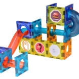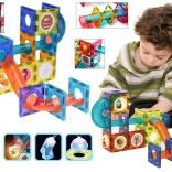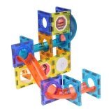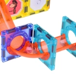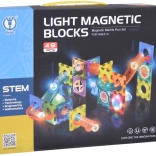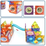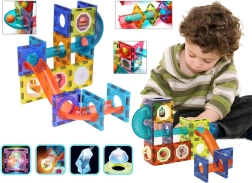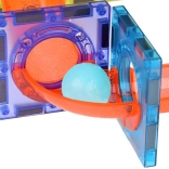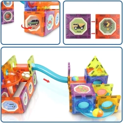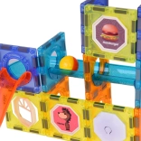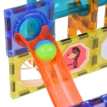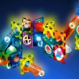 Die magnetische Bausteinbox mit 49 Teilen kombiniert kreatives Bauen, Lichteffekte und die Dynamik einer Kugelbahn. Transparente blaue, orangefarbene und gelbe Elemente lassen sich leicht verbinden und bilden 3D-Konstruktionen mit Tunneln, Brücken und Kurven. Leuchtende Kugeln und hinterleuchtete Module verleihen dem Spiel eine eindrucksvolle Optik und wecken die Neugier der Kinder.