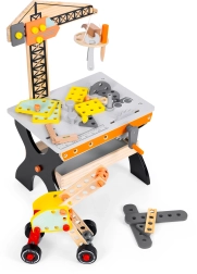 Entdecken Sie die kreative Werkstatt für kleine Tüftler: ein robuster Holz-Arbeitstisch mit Kran, Werkzeug und Verbindungselementen der Marke ECOTOYS. Fördert Feinmotorik, Hand-Auge-Koordination und Kreativität, bietet sichere Ausführung ohne scharfe Kanten und ermöglicht es, aus den enthaltenen Teilen bis zu 9 verschiedene Spielzeuge zu bauen.