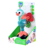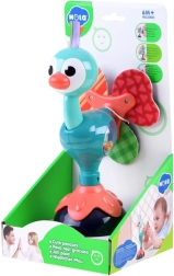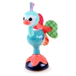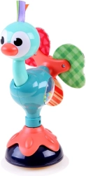 Der niedliche Pfau kombiniert glatte Kunststoffteile und weiche Textilelemente am Schwanz, um dem Baby unterschiedliche Texturen und Reize zu bieten. Nach dem Befestigen per Saugnapf dreht sich das Spielzeug um die eigene Achse und erzeugt beim Bewegen sanfte Rasselgeräusche, die Kinder zum Greifen und Entdecken motivieren.