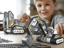Aus einem Set bauen Sie Panzer, Harvester, Gabelstapler und Kettenbagger – jedes Modell hat bewegliche Elemente und ist bereit für die Fernsteuerung.