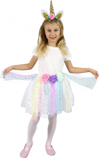 Verwandeln Sie Ihr Kind mit diesem farbenfrohen Kostüm in ein magisches Einhorn, das einen Tutu-Rock und einen Einhorn-Haarreif umfasst. Dieses Set ist ideal für Kinder, die märchenhafte Abenteuer beim Spielen erleben möchten. Der Rock ist mit buntem Tüll und Sternchen-Dekor verziert und dank seines elastischen Bundes leicht anpassbar.