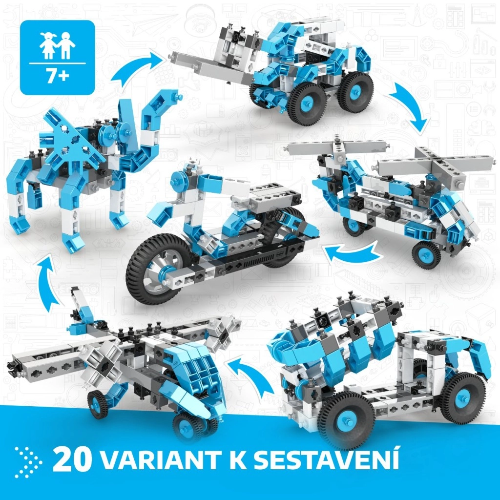 Vom Motorrad und Flugzeug bis zum Radlader, zu Robotern und Tieren – Kinder bauen 20 verschiedene Projekte und können sie jederzeit leicht umbauen.