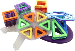 Das magnetische Konstruktionsset enthält 72 Teile in verschiedenen Farben und Formen, einschließlich fröhlicher Aufkleber. Verpackt in einer Schachtel. Verpackungsmaße ca. 40×29×6 cm. Alter 3+