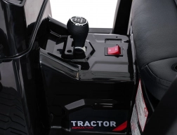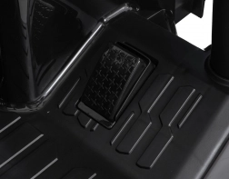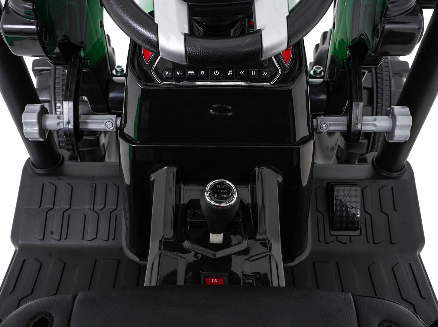 Für Sicherheit und Komfort stehen eine 2,4-GHz-Fernbedienung mit Not-Stopp, breite Sitze aus Eko-Leder und große Räder mit markantem Profil bereit. Kinder genießen die Fahrt mit LED-Lichtern und der umfangreichen Ausstattung des Audio-Panels – MP3, USB, Bluetooth, integrierte Melodien und Sounds im Lenkrad.