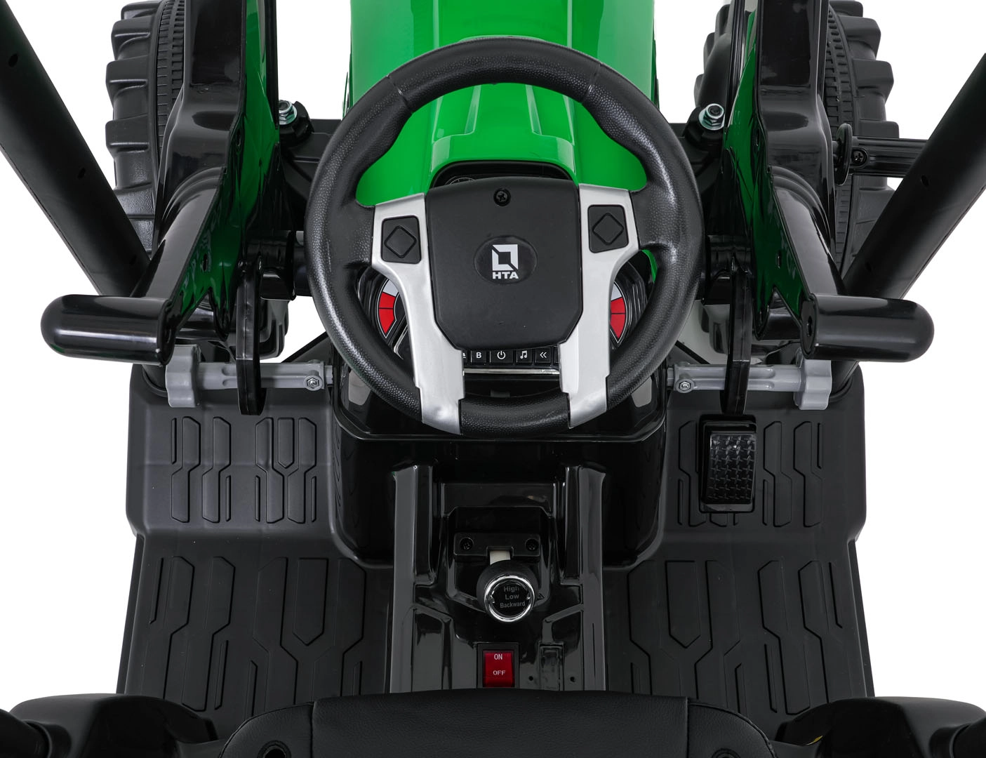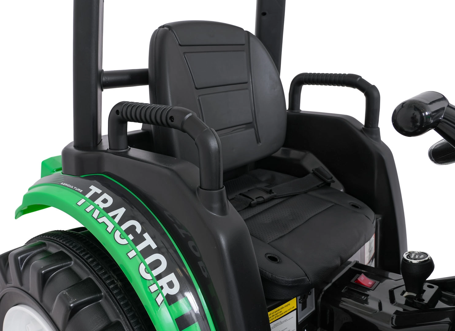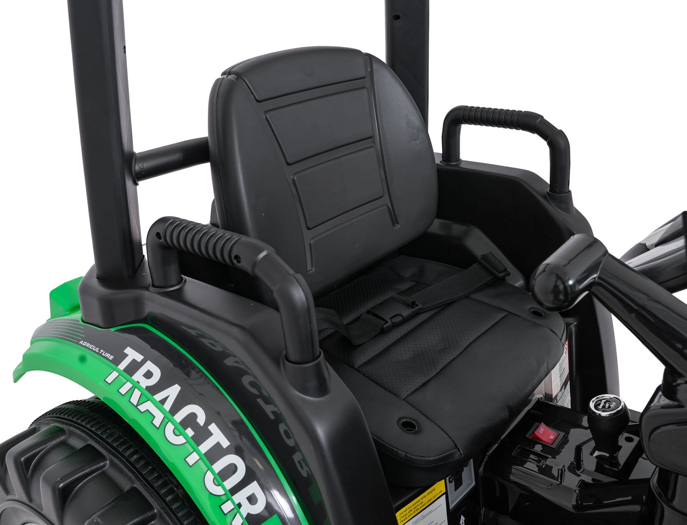 Der elektrische Traktor MEGA d68 in Grün ist die perfekte Wahl für kleine Traktorfahrer. Er bietet eine robuste Verarbeitung, eine funktionale Frontschaufel zum Beladen und einen geräumigen, abnehmbaren Anhänger für Spielzeug. Den Antrieb übernehmen 2 leistungsstarke 200-W-Motoren und ein zuverlässiger 24 V/7 Ah Akku, die zusammen für sanftes Anfahren, zwei Geschwindigkeiten sowie Vorwärts- und Rückwärtsfahrt sorgen.