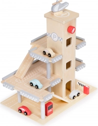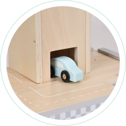 Dieses stilvolle Holzparkhaus begeistert jedes Kind, das Autos und kreatives Spiel liebt. Dank drei Ebenen, geschwungener Rampen und eines Aufzugs mit Halt auf jeder Etage bietet es stundenlangen Spaß und fördert Feinmotorik und Fantasie.