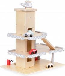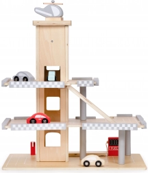 Mit dabei sind ein Hubschrauber mit Landeplatz auf dem Dach, 4 Autos, eine Tankstelle und eine bewegliche Schranke für besonders realistisches Spiel. Die hochwertige Holzausführung ohne scharfe Kanten sorgt für 100 % sicheres Spielen.