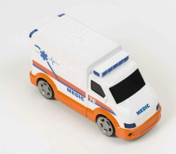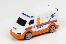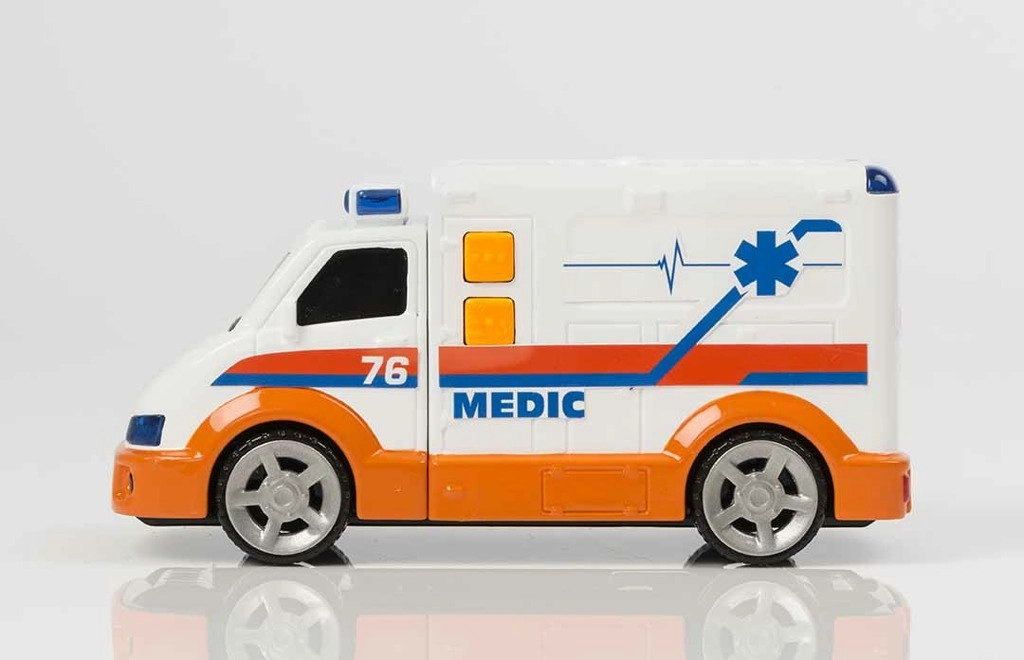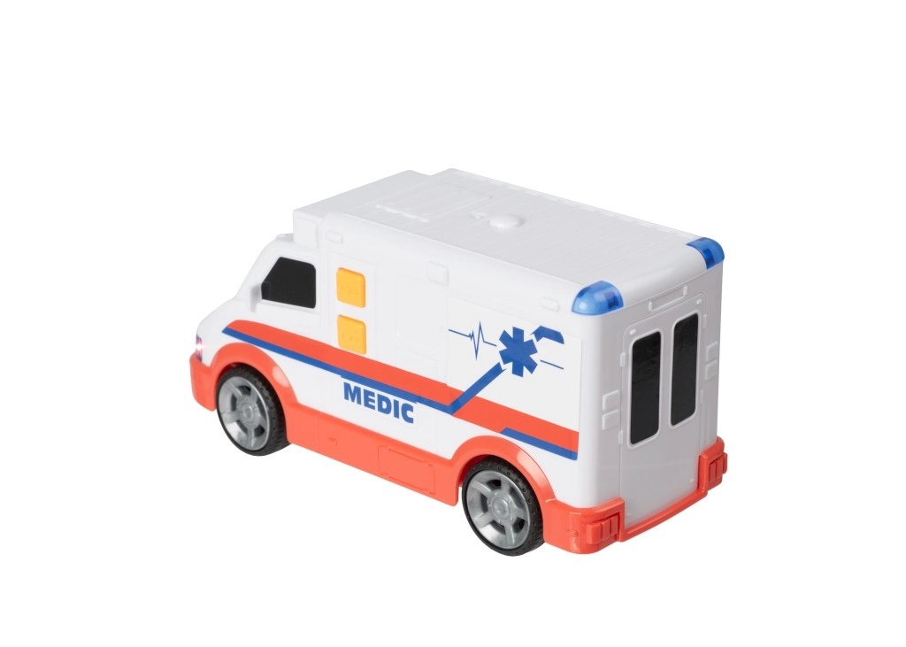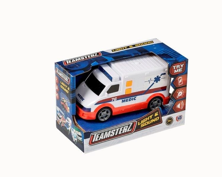Dieser detailreich gestaltete TEAMSTERZ-Krankenwagen bietet Kindern ein authentisches Einsatzerlebnis. Nach dem Drücken der Taste leuchtet das Blaulicht und es ertönen realistische Geräusche – Motorstart, Ausrücken zum Einsatz und Sirene bei schneller Fahrt. Das perfekte Spielzeug zur Förderung von Fantasie und Rollenspielen.