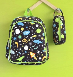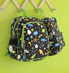 Stylischer Kinder-Rucksack mit Weltraum-Motiv – ideal für den Kindergarten und Ausflüge. Er bietet eine geräumige Hauptkammer, eine isolierte Fronttasche für Snacks und zwei Seitentaschen für Flaschen. Für Komfort und Sicherheit sorgen gepolsterte Schultergurte, ein Brustgurt gegen Abrutschen und ein atmungsaktives, gepolstertes Rückenteil.