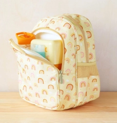 Stilvoller Kinder-Rucksack mit Regenbogenmotiv, ideal für den Kindergarten und Ausflüge. Er bietet ein geräumiges Hauptfach, eine isolierte Fronttasche für Snacks und zwei Seitentaschen für Flaschen. Für hohen Tragekomfort sorgen gepolsterte Träger, ein Brustgurt gegen Abrutschen und ein atmungsaktives, gepolstertes Rückenteil.