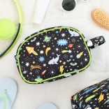 Schenken Sie Kindern Ordnung bei der Hygiene – auch unterwegs. Dieser verspielte Kulturbeutel mit Weltraum-Motiv fasst Shampoo, Seife, Zahnbürste, Zahnpasta und kleine Accessoires. Dank des seitlichen Griffs lässt er sich leicht tragen und im Bad oder in der Dusche aufhängen.