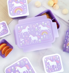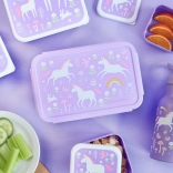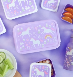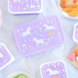 Die bezaubernde Lunchbox von A Little Lovely Company begeistert Kinder mit einem verspielten Design aus Einhörnern und Regenbogen und überzeugt Eltern durch die durchdachte Ausführung. Dank des dicht schließenden Deckels bleibt der Inhalt frisch und sicher verschlossen. Das herausnehmbare Tablett mit zwei Fächern ermöglicht eine übersichtliche Trennung von Obst, Gemüse, Gebäck oder Süßigkeiten.