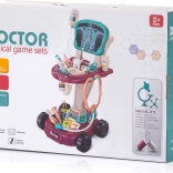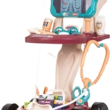 Der Wagen ist übersichtlich mit Ablagen strukturiert und enthält ein breites Set an Zubehör: Stethoskop, Infusion, Sauerstoffmaske mit Flasche und weitere notwendige Instrumente für kleine Ärzte. Dank der Rollen und der kompakten Maße von 58 × 42,5 × 32 cm ist er leicht zu bewegen und stabil beim Spielen.