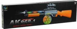 Erstklassiges Design: Das Gewehr AK 868-1 verfügt über eine schwarze Konstruktion mit braunen, holzähnlichen Elementen. Es ist mit einem Trommelmagazin für goldene Geschosse und einem abnehmbaren Visier ausgestattet, was ein einfaches Zielen ermöglicht.