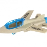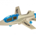 Das Jagdflugzeug verfügt über eine blaue Cockpithaube, die sich öffnen lässt, sowie sichtbare Bewaffnung mit orangefarbenen Enden – ideal für sicheres und kreatives Spielen.