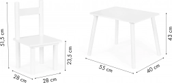 Tisch: 55 × 40 × 43 cm. Stuhl: Höhe 51,5 cm, Breite 28 cm, Sitzhöhe 23,5 cm. Ergonomie für Komfort und korrektes Sitzen von Kindern ab 3 Jahren.