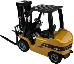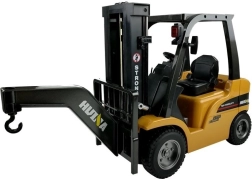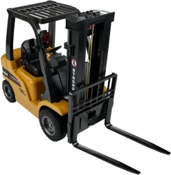 Der angebotene ferngesteuerte Gabelstapler ist ein wahrhaft leistungsstarkes Gerät. Das im Arbeitsfarbschema gehaltene Fahrzeug besitzt viele schwarze Elemente, die ihm einen entschlossenen Charakter verleihen. Dank der perfekten Reproduktion der Konstruktionselemente können Sie ihn bedenkenlos neben seinem Original präsentieren. Der Gabelstapler kommt mit zwei Spielzeugpaletten für den Warentransport. Neben der Funktion als „Gabelstapler“ verfügt das Fahrzeug über ein austauschbares Hakenmodul, mit dem es wie ein Kran arbeiten kann. Die Fernsteuerung zur Bedienung des Fahrzeugs ist mit großdimensionierten Bedienelementen ausgestattet, sodass sie von Personen mit unterschiedlichen Handgrößen bequem genutzt werden kann. Der Stapler wird von einem großen 7,2-V-Akku mit hoher Kapazität betrieben, der ein langes und problemloses Spiel garantiert. Die Fernsteuerung wird mit vier AA-Batterien betrieben – nicht im Lieferumfang enthalten.