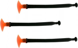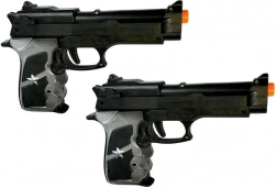 Zwei schwarze Spielzeugpistolen mit grauen Griffen und orangefarbenen Spitzen für Sicherheit, die realistisches, aber sicheres Spielen gewährleisten.