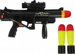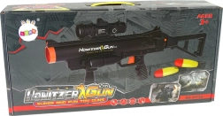 Dieser Kinder-Granatwerfer ist hervorragend ausgestattet für actionreiches Spiel zu Hause und draußen. An der Seite befindet sich eine funktionale Taschenlampe zur Ausleuchtung der Umgebung, oben ein Okular/Optik für besseres Zielen und hinten eine ausklappbare Stütze für stabilen Halt an der Schulter. Ein spezieller Federmechanismus sorgt für einen kräftigen Schuss, begleitet von realistischen Explosions-, Nachlade- und Serien-Schussgeräuschen. Die Schaumstoffraketen sind weich und sicher.
