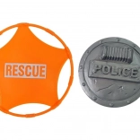 Diskus und Abzeichen mit Motiven der Rettungsdienste fördern die Vorstellungskraft der Kinder und ihre Geschichten bei Polizeieinsätzen.