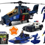 Dieses umfassende Polizeiset zieht Kinder in die Welt spannender Einsätze. Der große Hubschrauber mit Funktionstasten für Licht- und Soundeffekte schafft die Atmosphäre einer echten Mission, während Polizeiauto und Kajak die Spielmöglichkeiten an Land und auf dem Wasser erweitern. Eine Polizistenfigur und thematisches Zubehör runden alles ab.