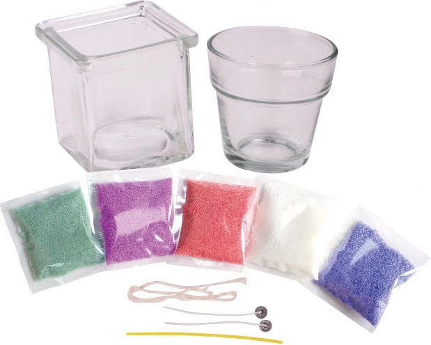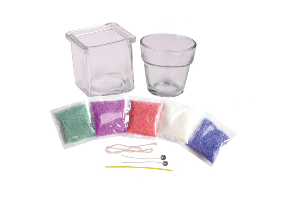 2 Glasgefäße für Kerzen, 5 farbige Wachse, Docht, Stäbchen