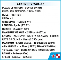 Die Konstruktionsstücke ermöglichen es Ihnen, eine genaue Nachbildung des Yakowlew Yak-1b-Flugzeugs zu bauen, das während des Zweiten Weltkriegs eine Schlüsselrolle in der Luftwaffe spielte.